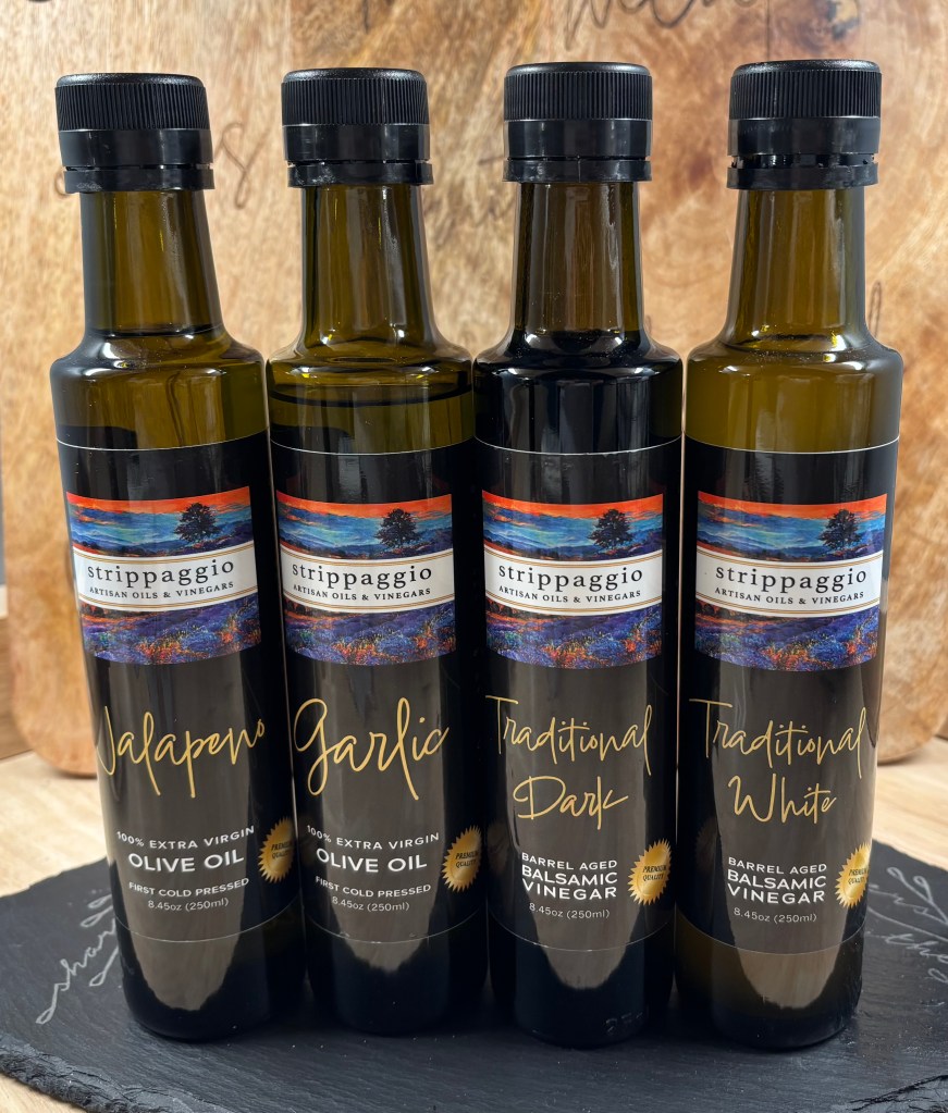 Elevate your next meal or charcuterie board with the bold flavors of Strippaggio Olive Oil and Balsamic Vinegars. While sampling their many varieties, the vendor explained that Strippaggio oils are fused, not infused—meaning the olives are crushed together with herbs, fruit, or spices during extraction for a richer, more authentic taste.